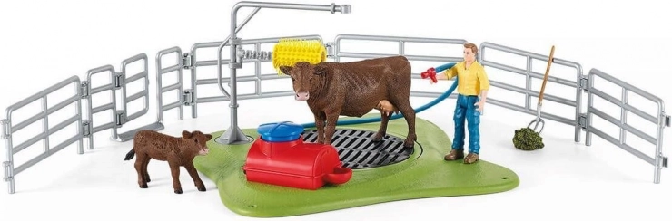 Le set comprend tout le nécessaire : figurines vache, veau et fermier, ainsi que des accessoires tels qu’un tuyau, une pompe à fonction pulvérisante, une brosse pour vaches, des clôtures en osier et un portail. Les détails de haute qualité, peints à la main et typiques de SCHLEICH, stimulent l’imagination et favorisent le jeu de rôle sur le thème de la ferme.