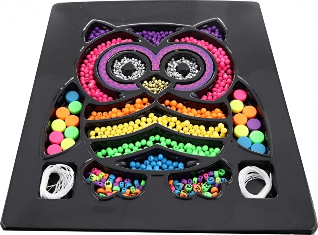 Un plateau malin en forme de chouette avec des compartiments séparés facilite le choix des perles et maintient l’espace de travail propre.