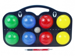 Ensemble de huit balles en plastique pour pétanque, chacune d'une couleur différente pour une identification plus facile. Emballage pratique pour le stockage et le transport.