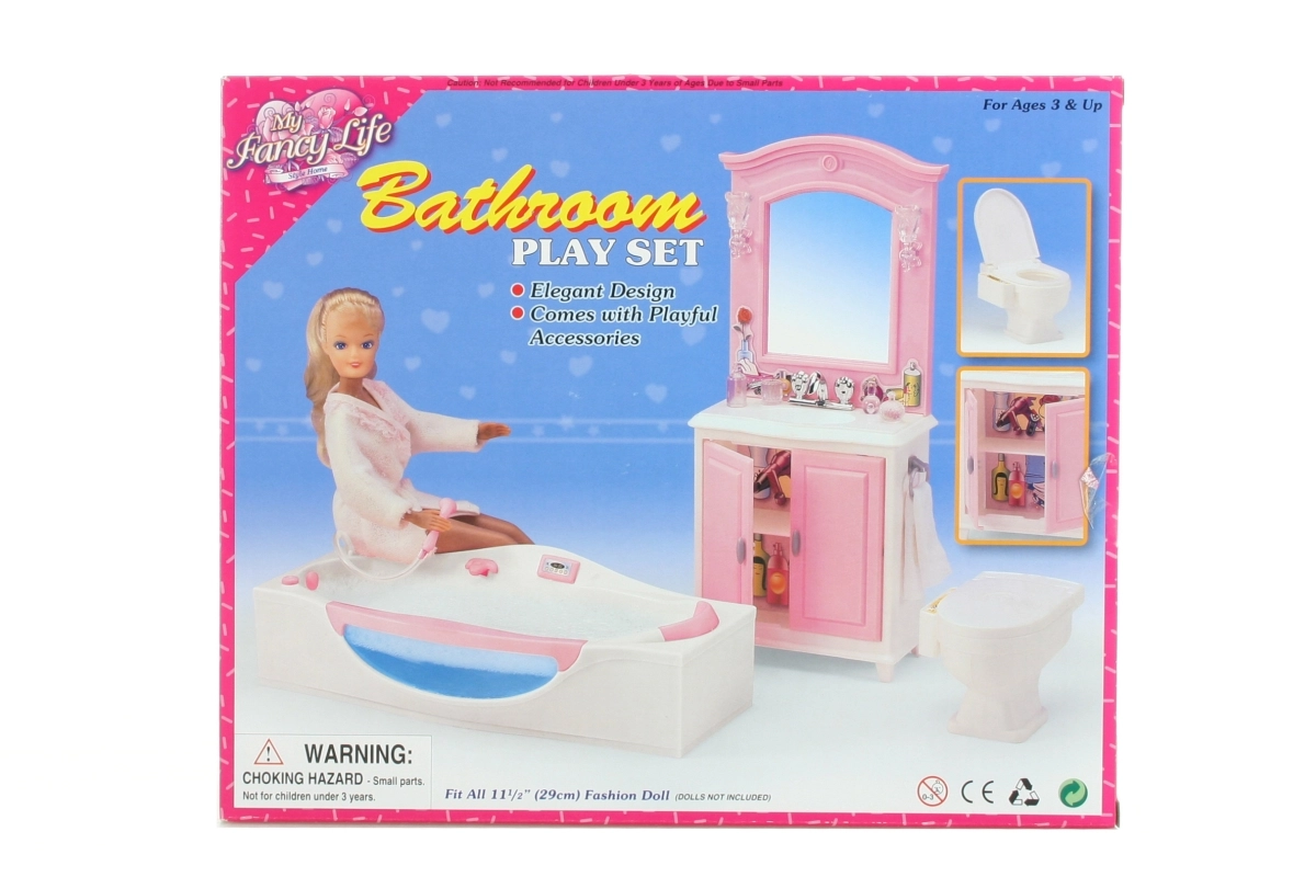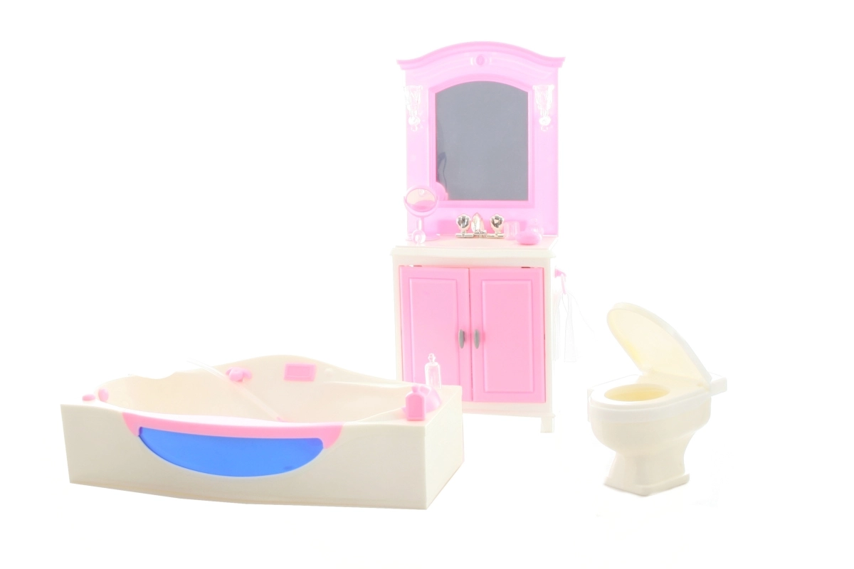 Le contenu de l’emballage inclut une coiffeuse avec lavabo, une baignoire et des toilettes, ainsi que de petits accessoires qui recréent l’ambiance d’une véritable salle de bain. La fabrication en plastique garantit un entretien facile et une longue durabilité lors d’un usage quotidien.