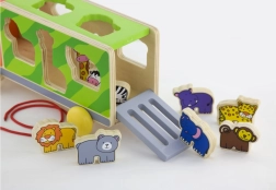Le camion se tire à l’aide d’une ficelle et sert aussi de boîte à formes astucieuse. Les enfants mobilisent mouvement et logique en cherchant les bonnes ouvertures pour les animaux.
