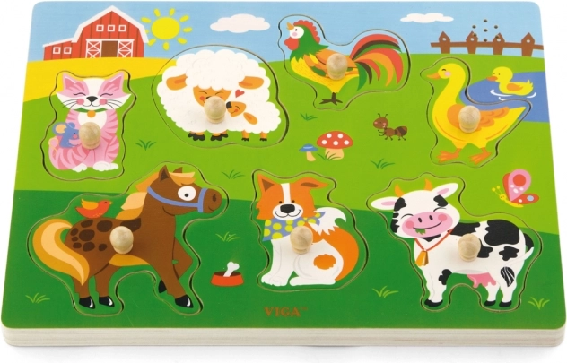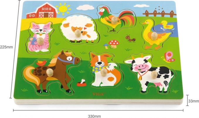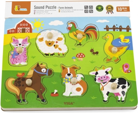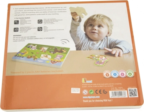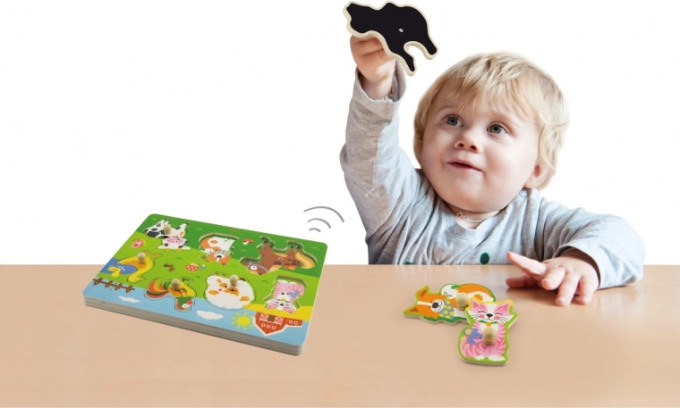 Puzzle encastrable en bois avec animaux, version sonore. Lorsque l’on place l’animal au bon endroit, le son correspondant retentit. Dimensions du plateau env. 30 × 22,5 × 2 cm. Alimentation 2 × piles AAA (non incluses). Dimensions de l’emballage env. 30 × 27 × 2 cm. Âge 18 mois et +