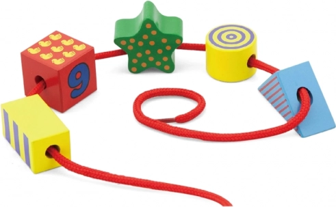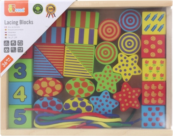 Découvrez un jeu créatif avec l’ensemble d’enfilage en bois VIGA – une boîte remplie de formes colorées à enfiler sur des cordons comme des perles. Favorise la motricité fine, la coordination œil–m... Voir plus
