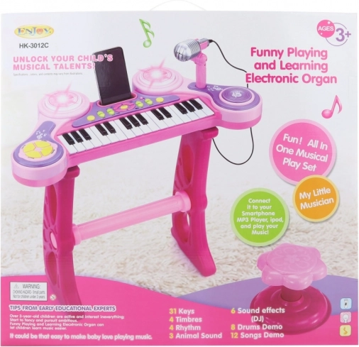 Grâce à ses fonctions intégrées, les enfants peuvent choisir différentes mélodies d’accompagnement, changer d’instruments et chanter au microphone. La connexion à un lecteur MP3 permet de lire des morceaux favoris pour jouer et chanter dessus.