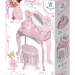 Elle offre deux tiroirs pour ranger les accessoires et un miroir, facilitant le jeu d'habillage.