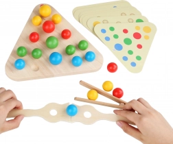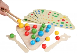 Les enfants trient les billes colorées à l’aide d’une pince et d’une cuillère selon les motifs des cartes – idéal pour développer la motricité fine, la concentration et la reconnaissance des couleurs.