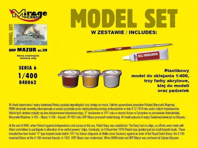 Construisez la canonnière polonaise iconique ORP Mazur (1939) à l’échelle 1:400. Kit complet pour débutants et modélistes confirmés comprenant un modèle en plastique, trois peintures acryliques, de la colle et un pinceau – idéal pour débuter dans le modélisme naval.