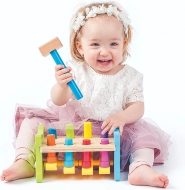 Cette version moderne du banc à marteler en bois de la marque WOODY apporte aux enfants le plaisir de découvrir et d’apprendre. Les chevilles sont reliées par un berceau en plastique, de sorte que chaque coup de marteau a un effet immédiat et visible – une cheville s’enfonce, l’autre ressort. Les enfants entraînent ainsi, en jouant, la force de leur prise, la précision et la patience.