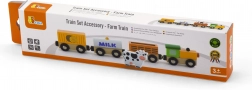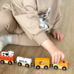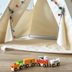 L’ensemble comprend une locomotive et trois wagons — une citerne marquée MILK, un wagon à bétail avec petite vache et un wagon de chargement. Les bords lisses et la conception durable conviennent parfaitement à la chambre d’enfant comme aux écoles maternelles.
