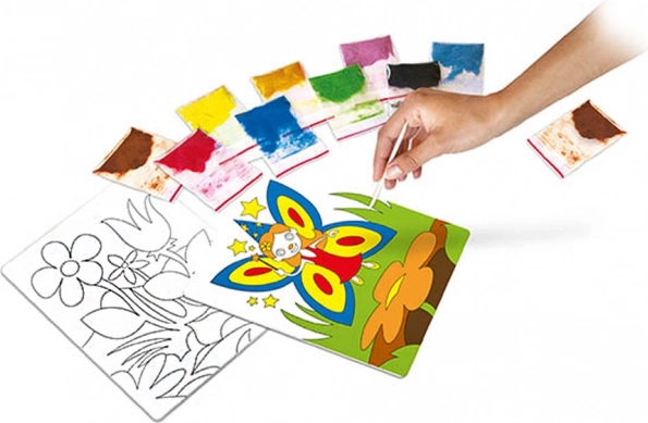 Le jeu artistique de peinture au sable consiste à dévoiler progressivement les différentes parties prédécoupées de l’image afin de mettre à nu la surface adhésive du fragment choisi. Chaque fragment dévoilé est ensuite saupoudré de sable de la couleur correspondant au modèle illustré indiqué dans le mode d’emploi et sur la boîte.