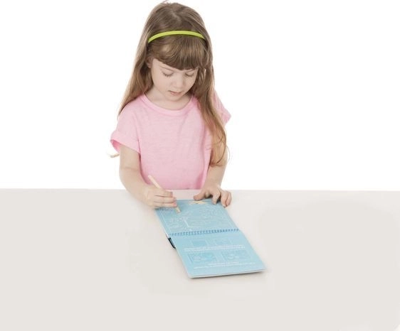 Une couche spéciale dissimule des teintes vives que les enfants dévoilent avec un stylet en bois. Création propre sans peintures ni pinceaux.