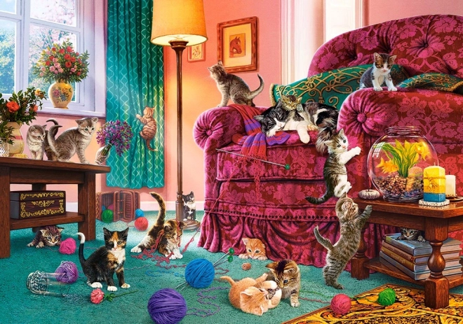 Le puzzle représente un salon cosy rempli de chatons joueurs et de pelotes de laine colorées.