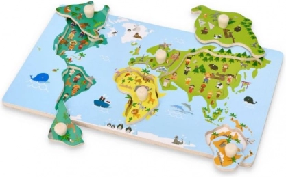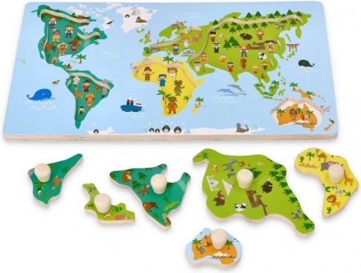 Le puzzle montre les continents avec des couleurs vives et des animaux et monuments dessinés, ce qui facilite l'apprentissage pour les enfants et rend la géographie amusante.