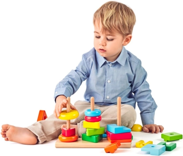 L’ensemble d’anneaux colorés et de pièces angulaires sur trois chevilles favorise la reconnaissance des formes et des couleurs ainsi que les premières compétences mathématiques.
