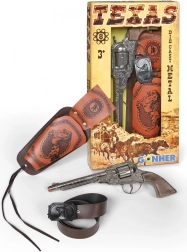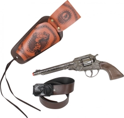 REVOLVER DE COWBOY EN MÉTAL GONHER 150/0 AVEC CASSETTERevolver de cowboy en métal pour 8 cartouches avec étui dans l’emballage.