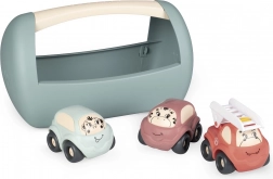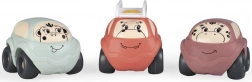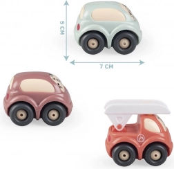 Deux petites voitures urbaines avec visages d’animaux et un camion de pompiers avec échelle sont résistants aux chocs et prêts pour le jeu quotidien.