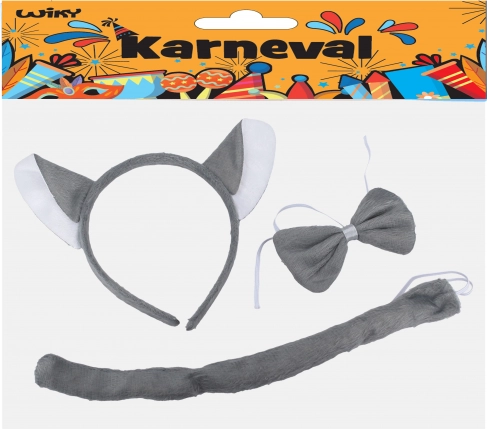 Set de carnaval loup pour enfants : serre-tête avec oreilles, nœud pour le cou et queue. Déguisement rapide et confortable pour carnaval et fêtes. Âge 6+.