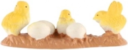 La décoration comprend trois poussins jaunes et plusieurs œufs blancs sur un socle marron, donnant à votre maison une ambiance joyeuse.