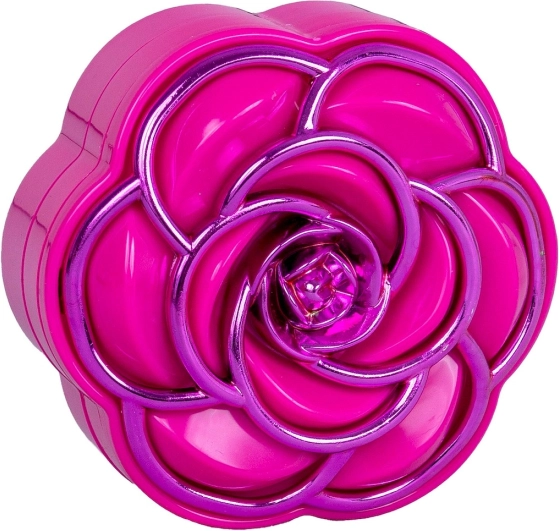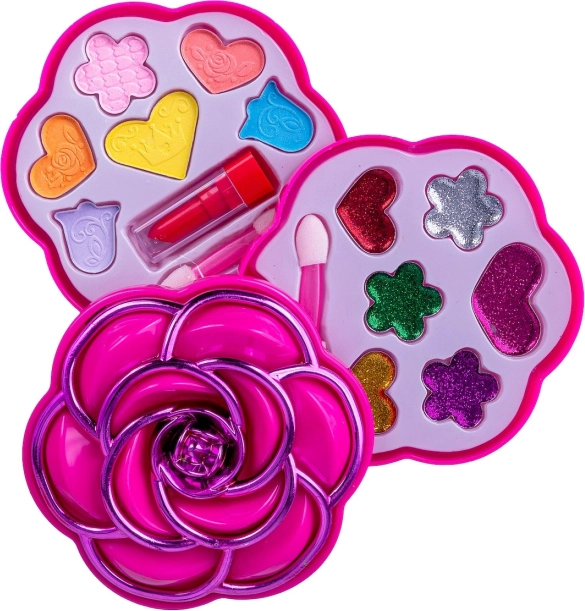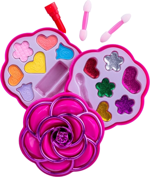 Coffret cosmétique pour enfants en forme de fleur : 2 étages de fards (pailletés et pastel) et rouge à lèvres rouge dans un étui compact rose. Idéal pour les petites princesses.