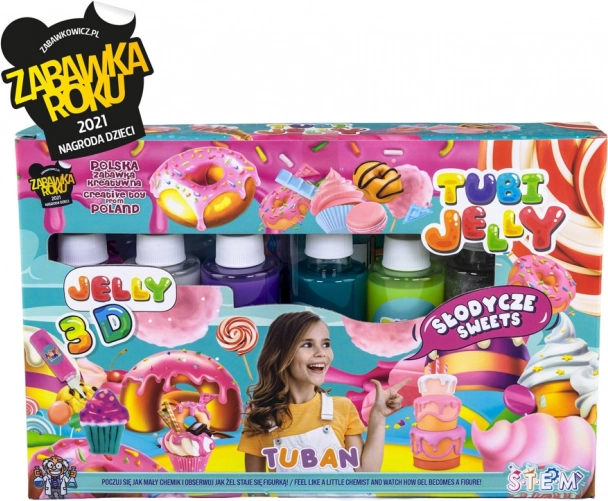 Set créatif TUBI JELLY Friandises : 6 couleurs de gel, 10 gabarits, activateur. Créez facilement et avec plaisir des figurines en gel 3D. Stimule la créativité des enfants.