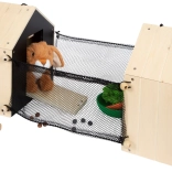 Ce clapier bien pensé en bois de qualité offre deux petites cabanes séparées – l’une pour un sommeil tranquille et l’autre avec une fenêtre grillagée pour observer les alentours. Il est facile d’y raccorder des clôtures en treillis afin de créer un enclos extérieur pour un jeu encore plus amusant. Le panneau arrière noir peut être écrit à la craie, apportant une dose supplémentaire d’interactions créatives.