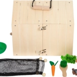 Lapin en peluche, clapier en bois (2 cabanes), 2 clôtures en treillis, balayette, écuelle, carotte en bois, morceau de salade, crottes en feutre