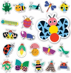 Des papillons, abeilles et coccinelles colorés stimulent l’imagination, l’apprentissage des formes et des couleurs ainsi que la motricité fine.