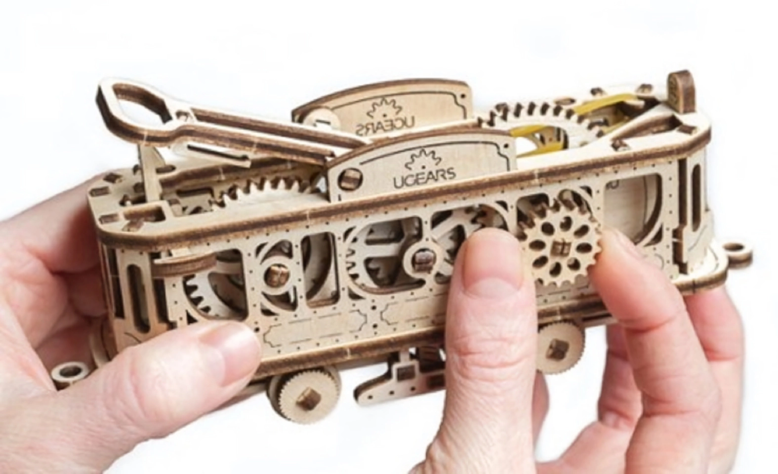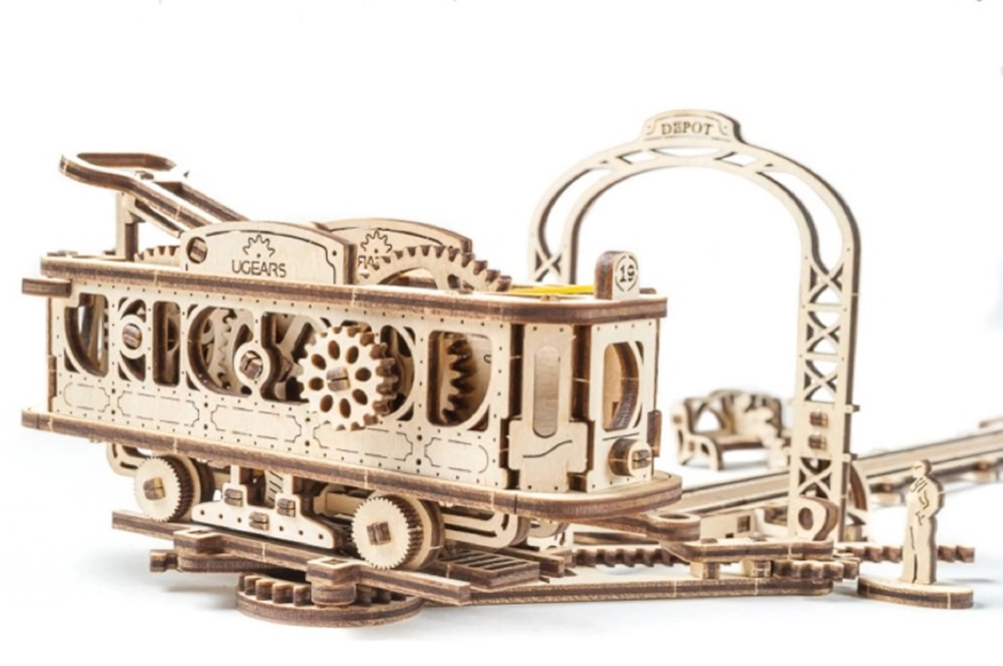 Houten mechanische bouwset UGEARS tramlijn Mechanical Town
