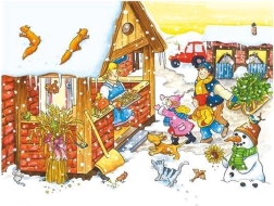 De winterafbeelding met een sneeuwpop, kinderen en dieren prikkelt de fantasie en nodigt uit tot samen verhalen vertellen.