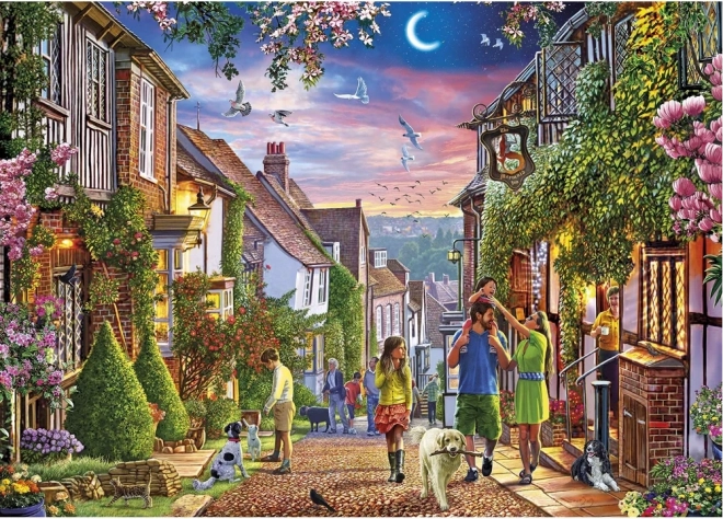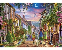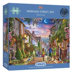 Ontdek de charme van een Britse straat met de GIBSONS-puzzel van 1000 stukjes, die de serene zomerse nachtelijke sfeer van Mermaid Street in Rye vastlegt. Geniet van de gedetailleerde illustratie met zacht licht uit de ramen, gezinnen die wandelen en vogels aan de maanverlichte hemel – ideaal voor puzzelliefhebbers die willen ontspannen.