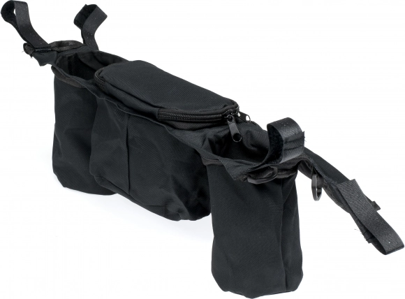 Twee open vakken voor drankjes worden aangevuld met een lang ritsvak en een kleiner ritsvak – alles wat je nodig hebt voor onderweg met je kind.