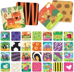 De set bevat 50 kaartjes (25 paren) met een logische indeling van dieren naar omgeving: weide, oerwoud, savanne, bos en boerderij. Dankzij de harde en duurzame kaarten en de felle kleuren en vormen is het spel aantrekkelijk en langdurig te gebruiken. Het biedt meerdere spelvarianten en is ideaal voor kleuters van 3–6 jaar.
