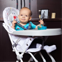 Praktische en stabiele stoel voor kinderen die zelfstandig kunnen zitten, tot 15 kg. Aangename materialen, een veilige 5-puntsgordel en een in 3 niveaus verstelbare voetensteun zorgen voor comfort bij elke maaltijd. Het ruime dienblad met bekerhouder is makkelijk schoon te houden.