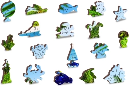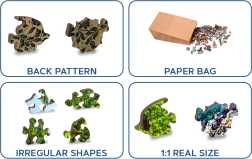 Speciaal gevormde stukjes – inclusief motieven van dieren en objecten – hebben nauwkeurig door laser geaccentueerde details en sommige kunnen als kleine figuurtjes rechtop worden gezet. De puzzel is ontworpen met aandacht voor gladde randen zonder splinters en een lange levensduur.