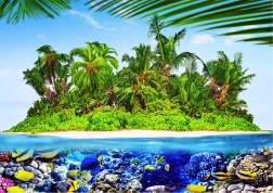 Leg de puzzel aan de hand van het kleurrijke motief van het exotische eiland, of probeer de uitdagendere zijde met een herhalend patroon op de achterkant.
