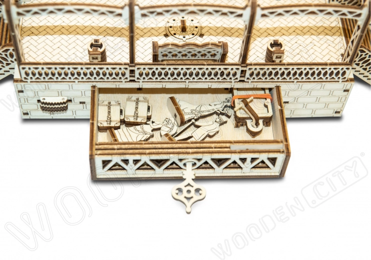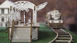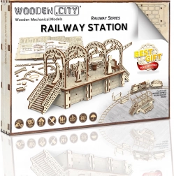 De houten 3D-puzzel WOODEN CITY Treinstation brengt de authentieke sfeer van een station met decoratieve bogen, bankjes en reizigersfiguurtjes. Montage gebeurt zonder lijm of gereedschap; de onderdelen passen precies en het eindmodel is niet alleen decoratief, maar ook functioneel – kleine spullen berg je eenvoudig op in het geheime vakje.
