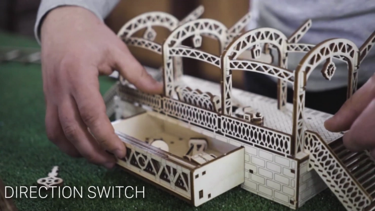 - Houten 3D-puzzel – mechanisch model van een treinstation