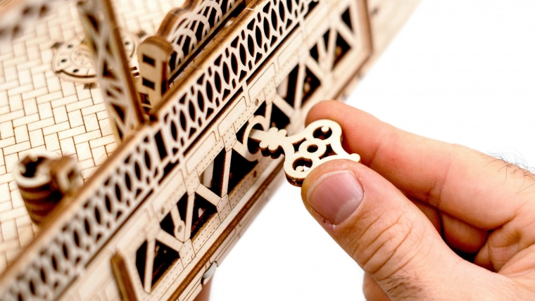 Precieze uitsparingen, tandwielen en een soepele werking na het inwrijven met was. De bouw verloopt schoon – de onderdelen passen exact in elkaar zonder lijm.