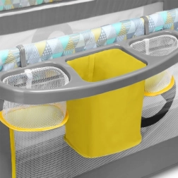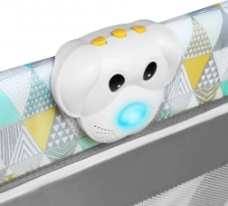 De rijke uitrusting omvat een verschoningstafel, een hangende inzet voor pasgeborenen (2 hoogtestanden), een zijpaneel met 3 vakken en een muggennet. De zij-ingang met rits en kinderslot maakt zelfstandig in- en uitstappen voor oudere kinderen mogelijk. Voor vermaak zorgen melodieën en een interactieve hond, terwijl wielen met rem het verplaatsen in huis en op reis vergemakkelijken.