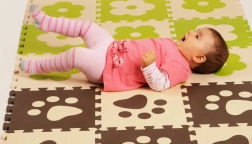 Praktische schuimrubberen vloerpuzzel in beige-bruine uitvoering met pootjesmotief creëert voor kinderen een prettig en veilig speeloppervlak. De tegels glijden niet dankzij het geribbelde oppervlak, het materiaal is zacht, afwasbaar en vrij van schadelijke stoffen, en het dempt bovendien geluid en isoleert uitstekend tegen kou. Afmeting per tegel 29,5 × 29,5 cm, dikte 0,9 cm. Geschikt voor kinderen vanaf 3 jaar.