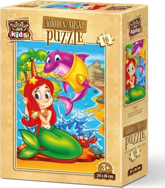 Ontdek de magie van de eerste puzzel voor kinderen: houten puzzel met een zeemeermin en haar vrienden. Bevat 16 stevige stukjes van veerkrachtig houten multiplex en heeft na het leggen een afmeting van ca. 16 × 24 cm – ideaal voor onderweg en thuis.