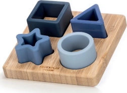 Deze kwalitatieve houten insteekpuzzel met blauwe siliconen stukjes (vierkant, driehoek, ster en cirkel) is ontworpen om kinderen op een natuurlijke manier te helpen bij het herkennen van vormen en kleuren. Het zachte oppervlak van de stukjes voelt prettig aan, ligt goed in de hand en motiveert tot herhaaldelijk spelen.
