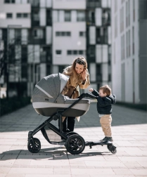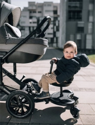 De montage is zo gebeurd – het bevestigingssysteem is robuust en toch snel en compatibel met de meeste Europese kinderwagens. Twee duurzame zwenkwielen met een diameter van 11,5 cm zorgen voor stabiliteit en een vloeiende beweging in de stad en in het park. De praktische opklapfunctie bespaart ruimte wanneer je het opstapje even niet gebruikt.