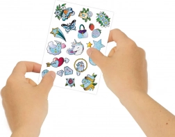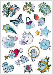 De set Crazy Chic Glinsterende Tatoeages bevat een brede waaier aan designs, waaronder eenhoorns, vlinders en andere motieven. De tatoeages zijn gemakkelijk aan te brengen en dermatologisch getest.