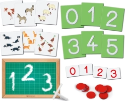 10 kaarten met ruwe cijfers, 11 cijferkaarten, 57 fiches, bord, krijtjes, wis-spons, 11 kaarten met hoeveelheden