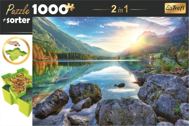 Complete set voor puzzelliefhebbers: een puzzel met het schilderachtige motief van het Hintersee-meer in Duitsland en een praktische stukjessorteerder in één verpakking. Bevat 1000 stukjes voor ontspannend puzzelplezier en zes stapelbare bakjes in de vorm van puzzelstukjes voor snel en overzichtelijk sorteren op vorm of kleur.