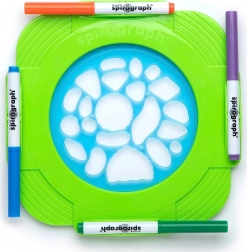 Inhoud van de verpakking: spirograaf met opbergruimte voor stiften en ontwerpwiel, 4 raamstiften en een duidelijke handleiding.
