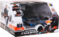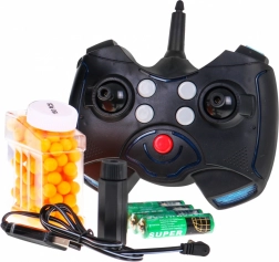 - Auto, afstandsbediening, kanister met 150 kogeltjes, USB-kabel voor opladen, batterijen voor afstandsbediening en vizier, voertuigaccu, stickers, handleiding