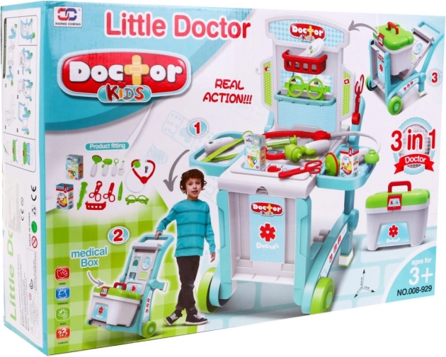 Mobiele praktijk voor kleine dokters: 3-in-1 – tafel op wieltjes, 2 typen trolley en een praktisch koffertje. Het rijke accessoirepakket stimuleert de fantasie en fijne motoriek, en het veilige ontwerp is ideaal voor kinderen vanaf 3 jaar.