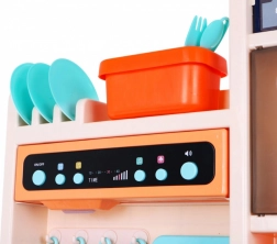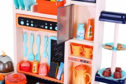 Grote multifunctionele kinderkeuken voor kleine koks vanaf 3 jaar met stromend water uit de kraan, een interactieve brander met stoom, licht- en geluidseffecten, een openende oven en koelkast en een uitgebreide set van 65 accessoires, inclusief een krijtbord en een “eierkoker” met geluiden.